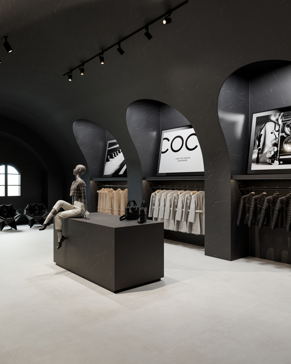 For those looking for a bolder, more contemporary option, Krion® Lux Stone Dark L910 is the perfect choice. This dark-toned finish offers a sense of mystery and sophistication, ideal for projects where a bold aesthetic is desired. Its deep tones make it ideal for highlighting specific areas within retail, such as showcases or VIP areas, adding a distinctive touch.