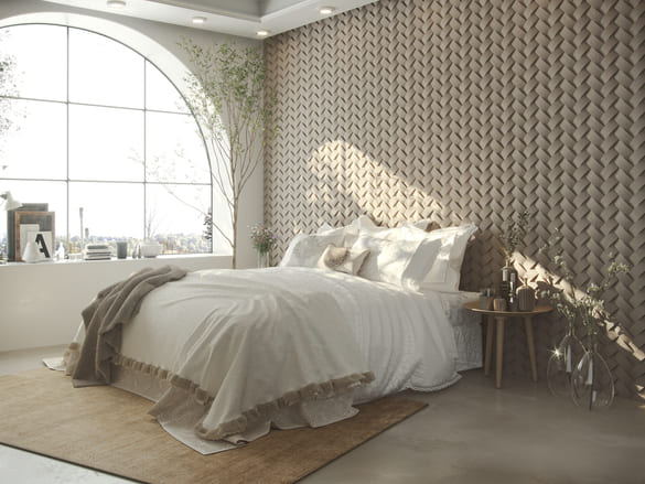 In bedrooms, furniture should combine comfort and aesthetics. Headboards with Fitwall® add a warm and sophisticated touch, while furniture made with Krion® or Alluslate® offers strength and design.