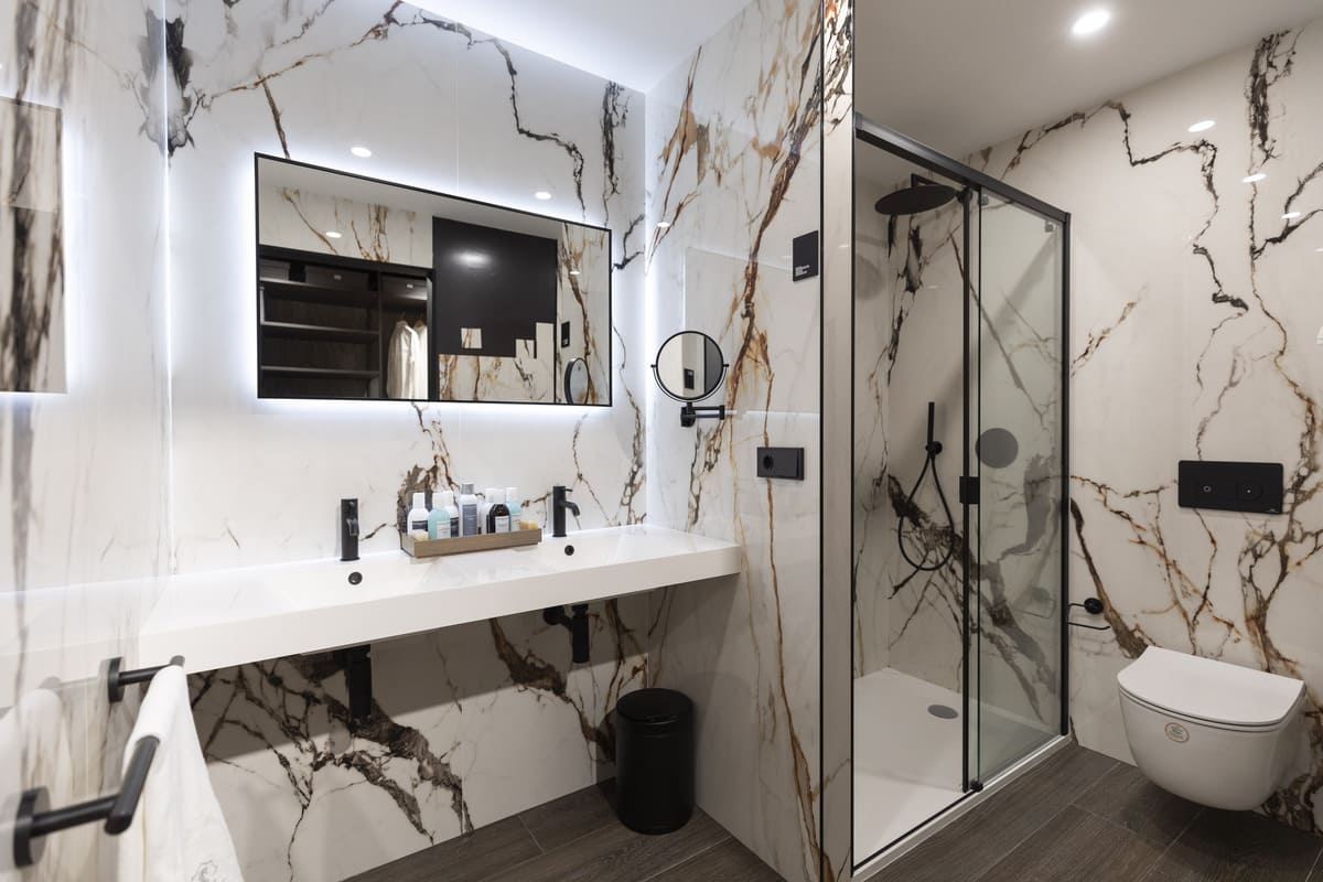 L'installation de systèmes d'éclairage intelligents, l'installation de systèmes de douche avec des commandes numériques pour réguler la température et la pression de l'eau avec précision, ou l'incorporation de robinets à faible consommation, ne sont pas seulement des options efficaces, mais favorisent également une utilisation responsable des ressources. Chez Krion, nous avons progressé dans ce domaine, et tant avec notre matériau Krion Shell®, qui contient un minimum de 5% de matériaux recyclés, qu'avec l'incorporation précoce de verre et d'aluminium recyclés dans nos cabines de douche, nous réduisons l'impact sur l'environnement en promouvant la durabilité.