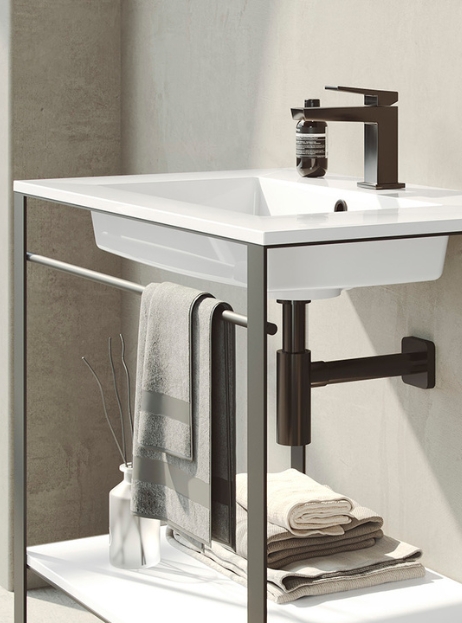 Elaborado con Krion Shell®. Es sostenible y ultra-resistente, tiene un fino espesor de 15 mm y unas líneas que le permiten alcanzar diseños atemporales. Se puede presentar suspendida con una elegante estructura metálica negra a suelo.